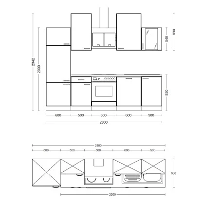 Die 310 cm breite Küchenzeile besteht aus (BxHxT):