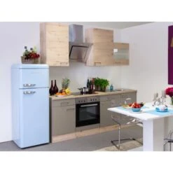 Zwei 89 cm hohe Hängeschränke und ein 55 cm hoher Hängeschrank mit bis zu zwei Einlegeböden bieten reichlich Platz für Geschirr und Gläser. In den Unterschränken mit einem Schubkasten und einer Drehtür finden Besteck, Töpfe und/oder Vorräte ihren Platz. Auch im Spülenunterschrank mit eingebauter Edelstahlspüle steht genügend Fläche zur Verfügung, um noch mancherlei Küchen- und Putzutensilien zu verstauen. Und wenn es wirklich einmal mehr werden sollte, können Sie Ihre Küche einfach mit weiteren Schränken aus der Serie erweitern.