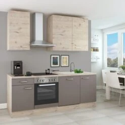 Die Fronten in Quarz-Cubanit und San Remo Eiche hell sorgen für ein warmes, einladendes Ambiente. Silberfarbene Metallgriffe runden das Gesamtbild harmonisch ab. Die hochwertigen Kunststofffronten bestechen nicht nur durch ihre Optik, sondern sind auch pflegeleicht.