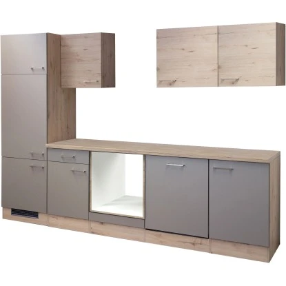 Die 280 cm breite Küchenzeile besteht aus (HxBxT):