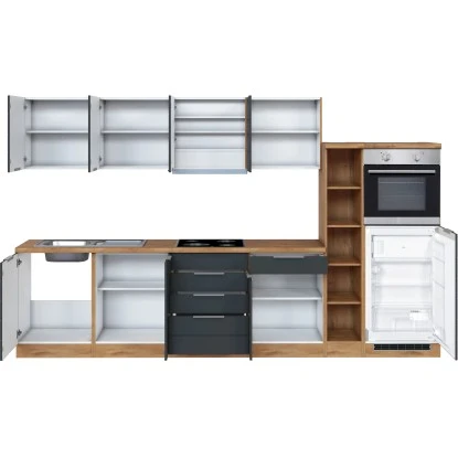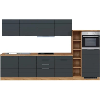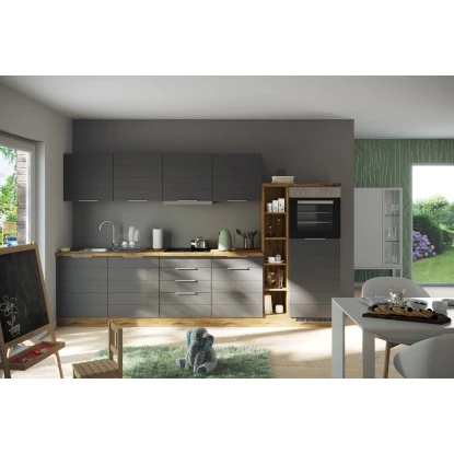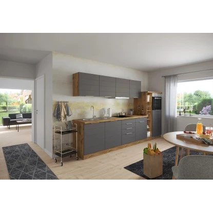 Die Küchenserie FLORENZ besticht durch ihre 2 absolut trendstarken Dekorkombinationen, in denen immer das ausdrucksstarke Wotan-Eichedekor eine entscheidende Rolle spielt. Elegante Metall-Griffleisten an hochwertigen MDF-Fronten mit Lisene in Mattweiß und Mattgrau werden mit einem ausdrucksstarken Eichedekor beim Korpus und der Arbeitsplatte kombiniert. So entsteht eine herausragende Optik, die genau den aktuellen Trend widerspiegelt. Eine Vielzahl an vordefinierten Zeilen und Winkel und verschiedenste Ergänzungsmöbel lassen keine Wünsche offen. In den Auszügen und hinter den Türen wird reichlich Stauraum für Küchenutensilien, Kochgeschirr und mehr geboten. Als Montagehilfe sind die einzelnen Schränke mit höhenverstellbaren Ausgleichsfüßen ausgestattet. Bestimmt werden Sie hier Ihre perfekte Küche finden!