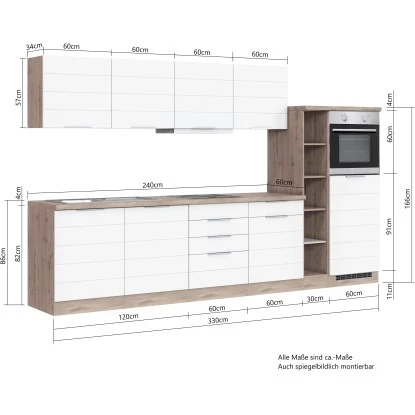 Die Küchenzeile wird Ihnen zerlegt und ohne Dekoration bis zu Ihrer gewünschten Verwendungsstelle geliefert. Die Anordnung der Küchenelemente und die Anschläge der Türen sind somit für Sie frei wählbar. Die Arbeitsplatte wird ohne Ausschnitte geliefert. Technische Änderungen und Irrtümer vorbehalten