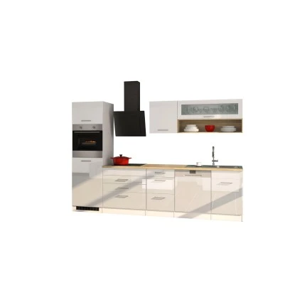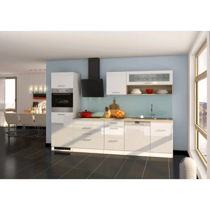 Die Serie Mailand zeichnet sich durch die hochglänzende MDF-Front, attraktiven Metallgriffen sowie der pflegeleichten Korpus-Kunststoffoberfläche aus. Die Schränke innen sind in Weiß gehalten. Zusätzlich findet sich hier eine Arbeitsplatte im Eiche Dekor ohne Ausschnitt für einen variablen Einsatz der Spüle.