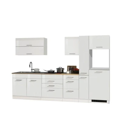 Die Serie Mailand zeichnet sich durch die hochglänzende MDF-Front, attraktiven Metallgriffen sowie der pflegeleichten Korpus-Kunststoffoberfläche aus. Die Schränke innen sind in Weiß gehalten. Zusätzlich findet sich hier eine Arbeitsplatte im Eiche Dekor ohne Ausschnitt für einen variablen Einsatz der Spüle.