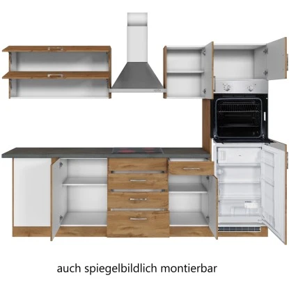 Die Küchenserie Sorrento besticht durch ihre 4 absolut trendstarken Dekorkombinationen, in denen immer das ausdrucksstarke Eichedekor eine entscheidende Rolle spielt. Durch eine Vielzahl an Zeilen- und Winkelkombinationen, die außerdem durch eine große Auswahl an Ergänzungsmöbeln komplettiert werden, ergibt sich ein breites Spektrum an Einrichtungsmöglichkeiten. Möchten Sie Ihren Backofen lieber autark in einem Hochschrank untergebracht haben? Benötigen Sie einen großzügigen Kühlschrank mit integriertem Gefrierschrank? Lagern Sie Ihre Vorräte gern in Auszügen und Apothekerschränken? Alle Schränke sind flexibel aufzustellen und die Türen sind wahlweise rechts oder links montierbar. Entscheiden Sie selbst- hier bleiben keine Wünsche offen.