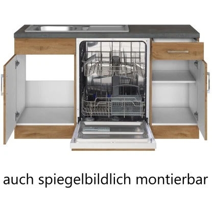 Die Küchenzeile wird Ihnen zerlegt und ohne Dekoration bis zu Ihrer gewünschten Verwendungsstelle geliefert. Die Anordnung der Küchenelemente und die Anschläge der Türen sind somit für Sie frei wählbar. Die Arbeitsplatte wird ohne Ausschnitte geliefert. Technische Änderungen und Irrtümer vorbehalten