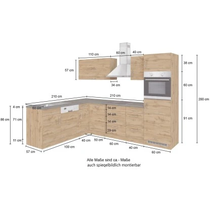 Die Held Möbel Küchenzeile Sorrento misst ca. B x H x T 210 cm x 200 cm x 270 cm und verfügt über eine 38 mm CPL-Arbeitsplatte mit Postformingkante.