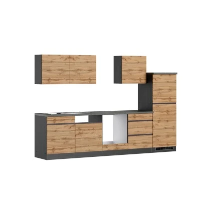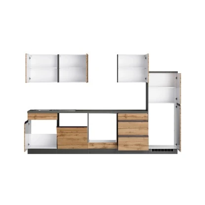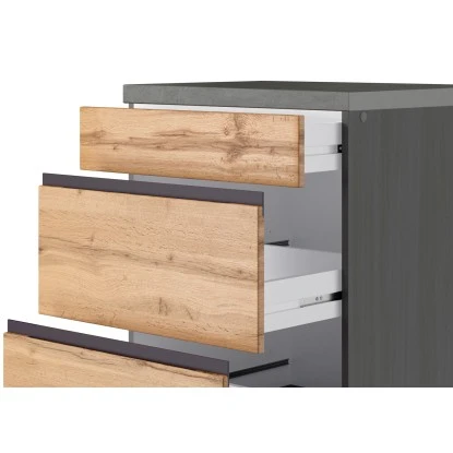 Die Küchenzeile Turin von Held Möbel mit hochwertigen MDF-Fronten begeistert optisch durch die klaren Linien sowie die zweifarbige Gestaltung. Da die Schränke in zwei Farbkombinationen verfügbar sind, können Sie die Küche im Mix-and-Match Stil erweitern. Zusätzliche Akzente werden durch die 38 mm starke Arbeitsplatte im Beton Dekor gesetzt.