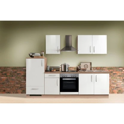 Die Küchenzeile Artisan Premium 270 cm in Lack Weiß überzeugt mit zeitloser Optik und durch ein unschlagbares Preis-Leistungsverhältnis. Die Küche besticht insbesondere durch die Kombination aus Design, Funktion und Robustheit. Sie besteht aus Kühlschrank mit ***Gefrierfach, Edelstahl-Herd mit Backofen und Dunstabzugshaube, Spüle mit Unterschrank, einem weiteren Unterschrank mit Schublade, einer Schublade unter dem Kühlschrankumbau und Hängeschränken. Die Arbeitsplatte wird ohne Ausschnitte in einer Stärke von 38 mm geliefert.