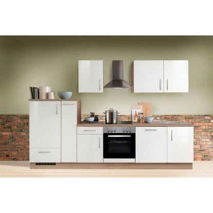 Die Küchenzeile Artisan Premium 310 cm in Lack Weiß überzeugt mit zeitloser Optik und durch ein unschlagbares Preis-Leistungsverhältnis. Die Küche besticht insbesondere durch die Kombination aus Design, Funktion und Robustheit. Sie besteht aus Kühlschrank mit ***Gefrierfach, Edelstahl-Herd mit Backofen und Dunstabzugshaube, Geschirrspüler vollintegriert, Spüle mit Unterschrank, einem weiteren Unterschrank mit Schublade, einer Schublade unter dem Kühlschrankumbau und Hängeschränken. Die Arbeitsplatte wird ohne Ausschnitte in einer Stärke von 38 mm geliefert.