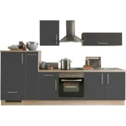 Die Küchenzeile Premium mit einer Breite von 300 cm überzeugt mit zeitloser Optik und einem unschlagbaren Preis-Leistungsverhältnis. Die Küche besticht insbesondere durch die Kombination aus Design, Funktion und Robustheit. Alle Möbelteile werden in Deutschland gefertigt und zeichnen sich durch hochwertige Qualität aus. Die teilweise mit Schubladen ausgestatteten Unterschränke und die Hängeschränke bieten viel Stauraum für Ihre Küchenutensilien. Zudem sorgen die modernen Elektrogeräte für hohen Komfort beim Kochen. Die Küchenzeile besteht aus Kühlschrank mit 3-Sterne-Gefrierfach, Edelstahl-Herd mit Backofen und Dunstabzugshaube, Spüle mit Unterschrank, einem weiteren Unterschrank mit Schublade, einer Schublade unter dem Kühlschrank und einem Hängeschrank sowie einem Klappenhänger. Die Arbeitsplatte wird ohne Ausschnitte in einer Stärke von 38 mm geliefert.