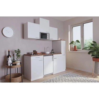 Die ideale Küchenzeile für das Büro, die Single- oder Studentenwohnung. Der funktionelle Küchenblock weiß mit einem zeitlosen Design und einer aktuellen Farbkombination zu gefallen und bietet Ihnen stets ein hohes Maß an Komfort. Sein trendiger, 30 cm breiter Apothekerschrank ist von beiden Seiten zugänglich und wirkt wie ein kleines Raumwunder. Mit einer Breite von 30 cm schafft er viel übersichtlichen Stauraum für Ihre Vorräte.