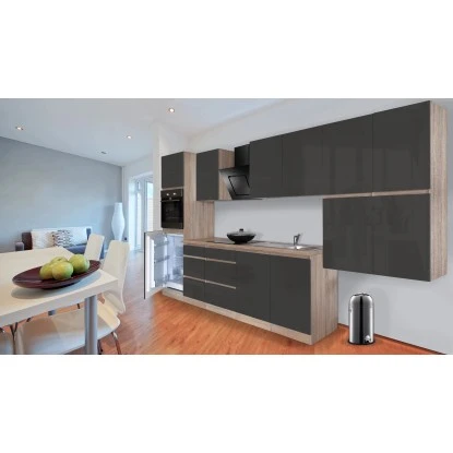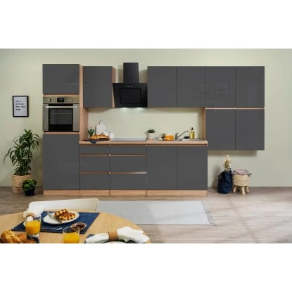 Respekta Küchenzeile GLRP370HESG Grifflos 370 Cm Grau Hochglanz-Sonoma Eiche
