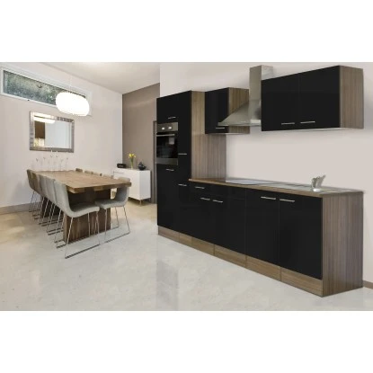 Die 300 cm breite Respekta Economy Küche ist die ideale Küche für Familien, Paare und Wohngemeinschaften. Ihr Eiche York Dekor sowie die Seidenglanzfronten in verschiedenen Farben machen die Küchenzeile zu einem Blickfang. Die Ober- und Unterschränke sowie Schubladen und ein Apothekerschrank bieten viel Stauraum für Ihre Küchenutensilien und Vorräte. Die Elektrogeräte komplettieren die Küchenzeile und machen sie zum geschmackvollen Einrichtungselement.