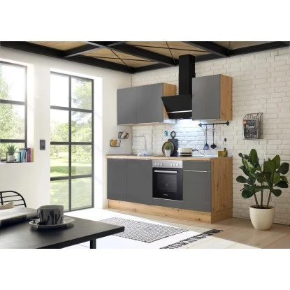 Die Respekta Küchenzeile Marleen ist in verschiedenen Farben erhältlich und schafft durch den Materialmix von Elementen in Holz- und Griffleisten in Aluminiumoptik ein modernes Design. Die Schränke bieten Ihnen viel Stauraum und schließen dank der Soft Close Funktion besonders geräuscharm. Unebenheiten im Boden gleichen Sie mit den höhenverstellbaren Füßen ganz einfach aus.