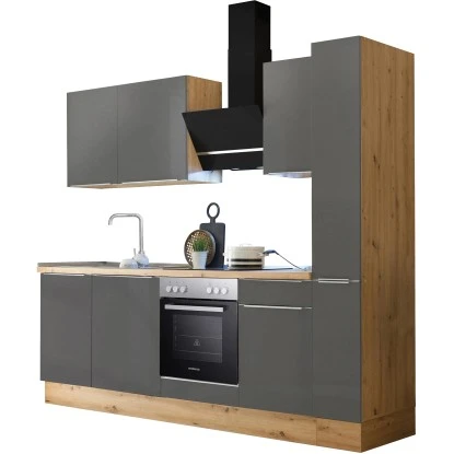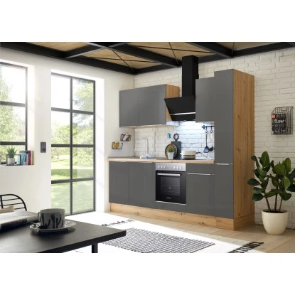 Die Respekta Küchenzeile Marleen ist in verschiedenen Farben erhältlich und schafft durch den Materialmix von Elementen in Holz- und Griffleisten in Aluminiumoptik ein modernes Design. Die Schränke bieten Ihnen viel Stauraum und schließen dank der Soft Close Funktion besonders geräuscharm. Unebenheiten im Boden gleichen Sie mit den höhenverstellbaren Füßen ganz einfach aus.