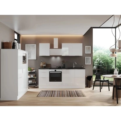 Die Respekta Selection Küchenzeile Elisabeth 370 cm bietet Ihnen alles, was Sie erwarten, um Ihren Traum von einer modernen und funktionalen Küche zu verwirklichen. Mit einer Arbeitshöhe von 91 cm und höhenverstellbaren Sockelfüssen ermöglicht sie Ihnen ein komfortables und ergonomisches Kochen. Dank der Schubkästen und Auszüge mit Vollauszug und Dämpfung, sowie der Glaseinlegeböden bei den Hängeschränken können Sie den Stauraum optimal ausnutzen. Profitieren Sie von der Lieferung fertig montierter Küchenschränke und erhalten Sie eine leistungsstarke und moderne Küchenlösung, die Sie über viele Jahre hinweg begleiten wird.