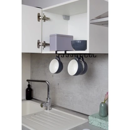 Wenn der Platz in der Küche knapp bemessen ist, ist der dekorative, schwarze Tassenhalter von Wenko eine praktische Alternative, um möglichst viele Tassen platzsparend und ordentlich im Schrank oder unter dem Regal unterzubringen. Bei Bedarf kann der Halter mit einem Griff wieder entnommen werden. Die sauber gespülten Tassen werden einfach am Henkel in den praktischen Tassenhalter gehängt. So werden bis zu 10 Tassen stets sicher und vor Staub geschützt aufbewahrt.