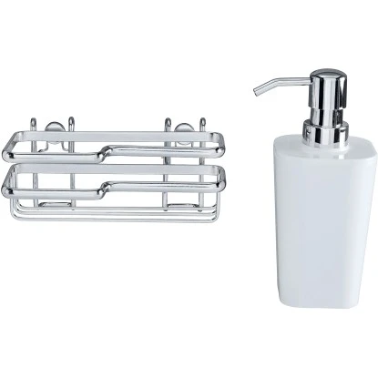 Das praktische Spül-Set der Style-Serie von Wenko besteht aus einer Wandhalterung aus glänzendem, verchromtem Metall, einem weißen Spülmittel-Spender und einem Schwamm. Das Spül-Set bietet somit eine platzsparende und großzügige Aufbewahrungsmöglichkeit für alle Spülutensilien.